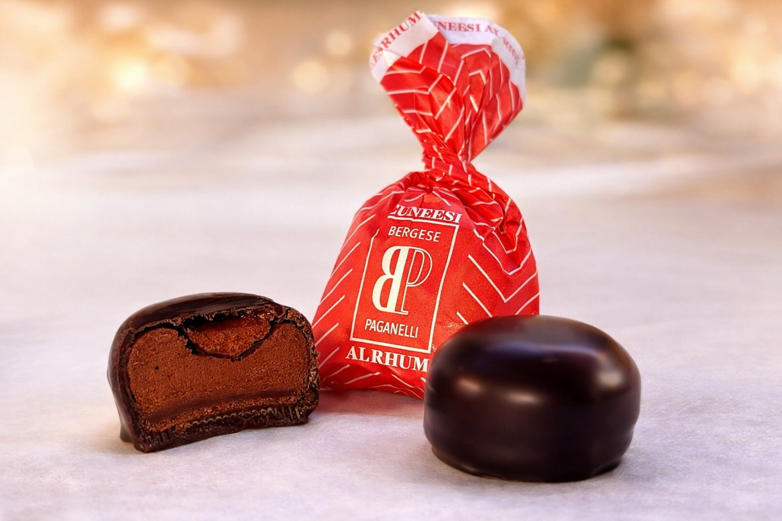 INGREDIENTI: cioccolato fondente (pasta di cacao, zucchero, burro di cacao, emulsionante: lecitina di soia, aroma naturale di vaniglia. Cacao min. 57%) cioccolato fondente (pasta di cacao, zucchero, burro di cacao, emulsionante: lecitina di soia, aroma naturale di vaniglia. Caco min. 55%). Rhum 60°min.13,5%, latte intero uht, zucchero, uova, glucosio, amido di mais, cacao in polvere.