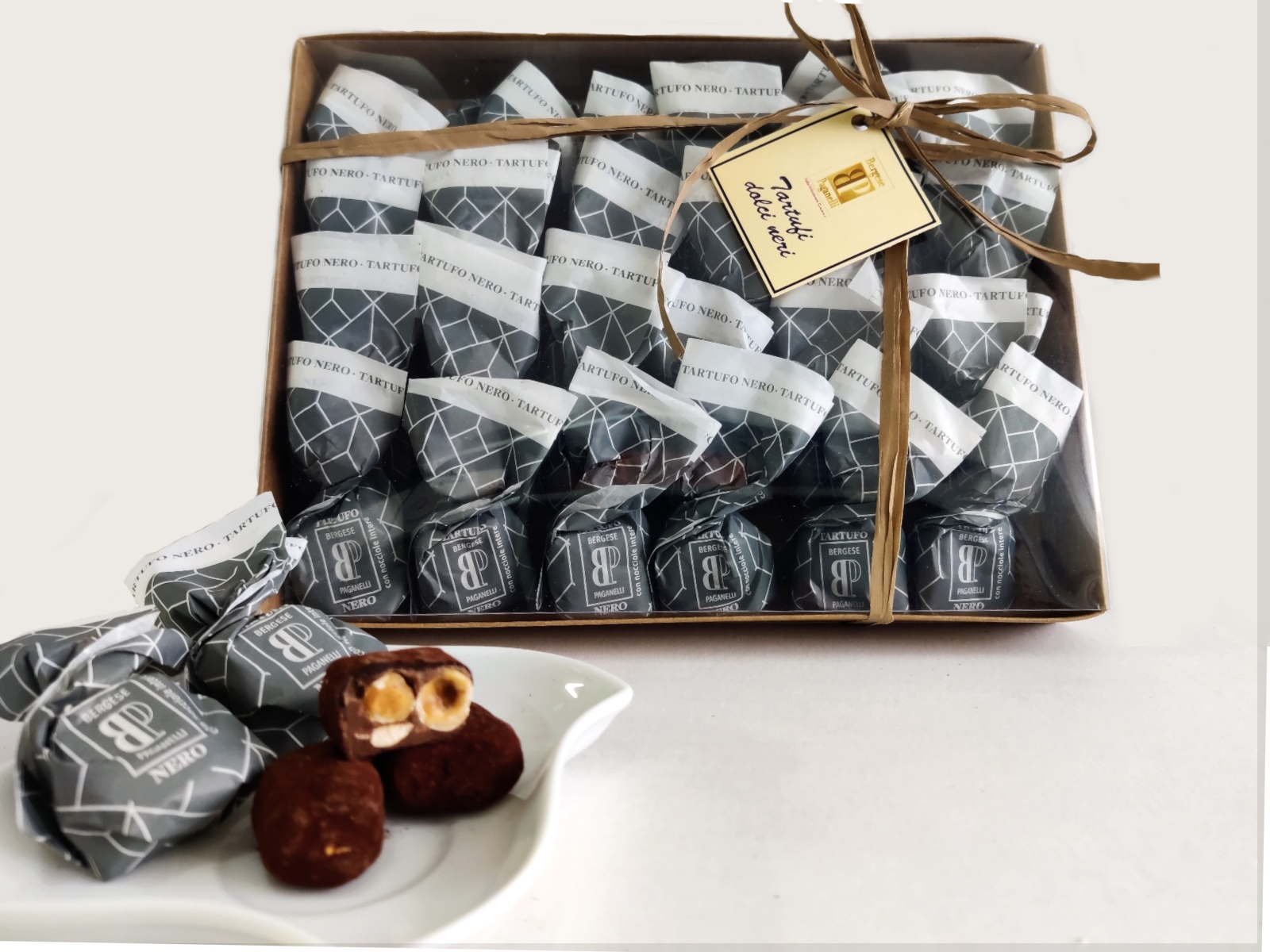 Il cioccolato fondente ricopre un impasto di nocciole e pasta di nocciole. Una spolverata di cacao impreziosisce ulteriormente la pralina che riprende nel nome e nella forma il tartufo nero. Il gusto è estremamente piacevole, poco zuccherino: sicuramente adatto agli amante del cioccolato fondente. Premiati nel 2006 da Slow Food